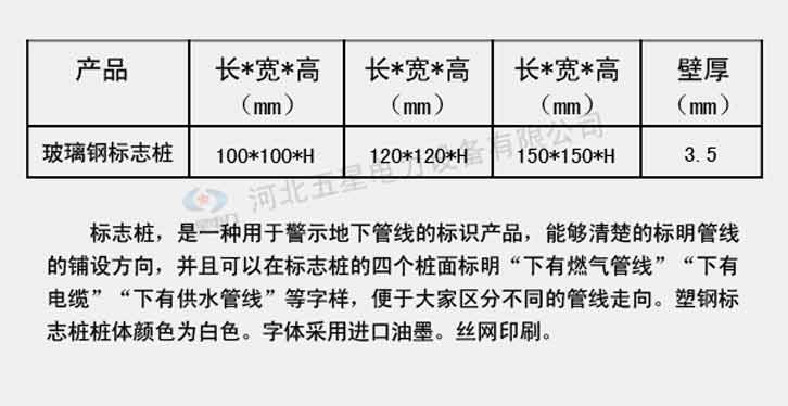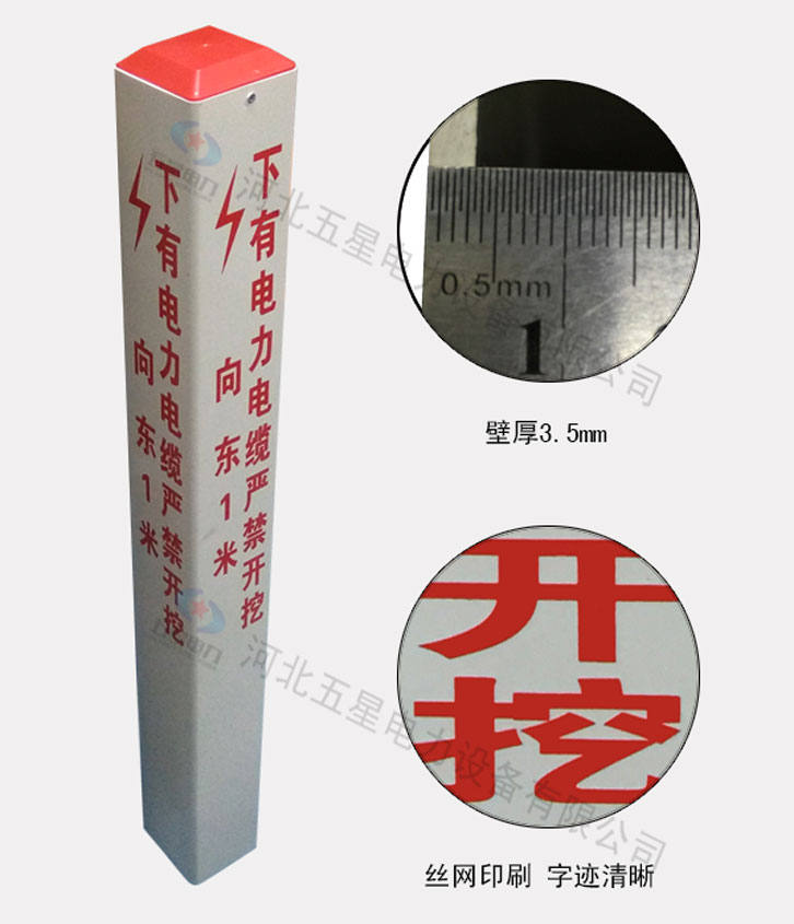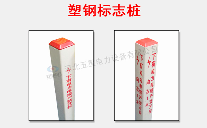 塑鋼標志樁采用塑鋼材質制成,也稱為pvc標志樁,樁體為白色,常規規格為100mm*100mm、150mm*150mm。塑鋼標志樁材質輕便、彈性好、耐酸堿、耐腐蝕、抗老化性能好、安裝運輸方便,是警示地下管線的標識產品,能夠清楚的標明管線的鋪設方向,便于大家區分不同的管線走向。