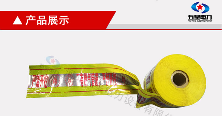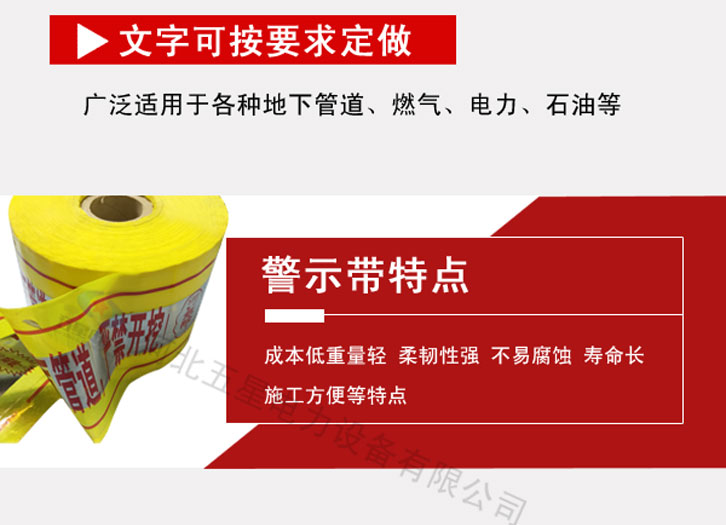 地埋式可探測警示帶:寬度:10cm-150cm 厚度:0.12mm、0.15mm、 顏色:多用黃底紅字。中間夾層中有一層鋁箔,寬度約為5-cm