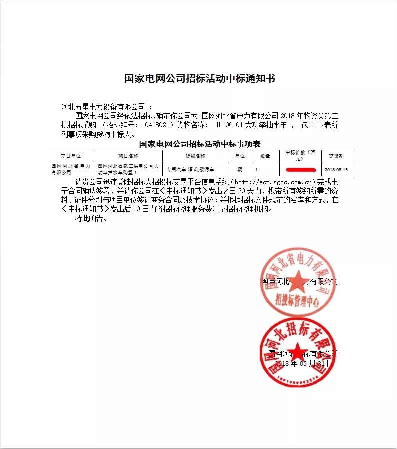 國(guó)家電網(wǎng)公司經(jīng)依法招標(biāo),確定河北五星公司為國(guó)網(wǎng)河北省電力有限公司“”2018 年物資類(lèi)第二批招標(biāo)采購(gòu) (招標(biāo)編號(hào): 041802 )”項(xiàng)目中,河北五星研制生產(chǎn)的“大流量應(yīng)急搶險(xiǎn)排澇車(chē)”一舉中標(biāo)!!